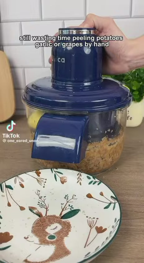 The motor spins the fruit against sharp blades to remove peel quickly while reducing waste